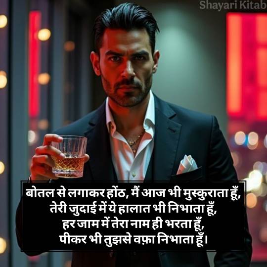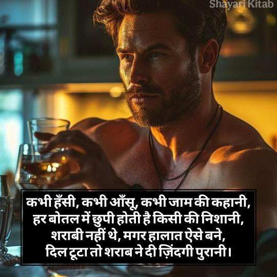 आज के दौर में भी शराबी शायरी दर्द भरी सोशल मीडिया और महफिलों में खूब पसंद की जाती है। युवाओं से लेकर उम्रदराज़ लोगों तक, हर कोई कभी न कभी खुद को किसी शराबी शेर में ढूंढ लेता है। यही इसकी खूबसूरती है जो हर दिल को छू जाती है। यह शराबी शायरी आपके दोस्तों को भी पसंद आएगी और आपकी महफिल में भी चार चांद लगा देगी। इस शराबी शायरी को आप अपने व्हाट्सएप स्टेटस पर जरूर लगाए, और सोशल मीडिया पर भी जरूर शेयर करें।